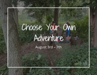Choose Your Own Adventure: Freedom and imagination shape every day at Choose Your Own Adventure camp, an open-ended nature experience built around play and curiosity. With plenty of time for mud kitchens, loose-parts play, nature art, building challenges, and open exploration, campers decide how their adventure unfolds! Camps are Monday – Friday from 9:00am – 12:00pm and for campers entering 4th through 6th grades in the fall.